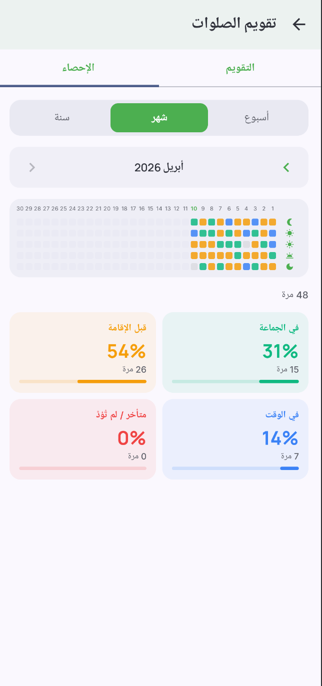 متابعة يومية مع 4 مستويات جودة — متأخر، في الوقت، في المسجد، أو قبل الإقامة.