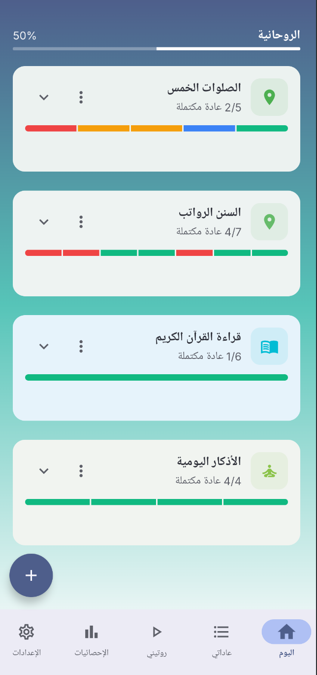 روتيني ليس محدوداً بالعمل والإنتاجية — يدعم أيضاً الصلاة والتأمل والامتنان والقراءة والحفظ والروتينات الروحية.