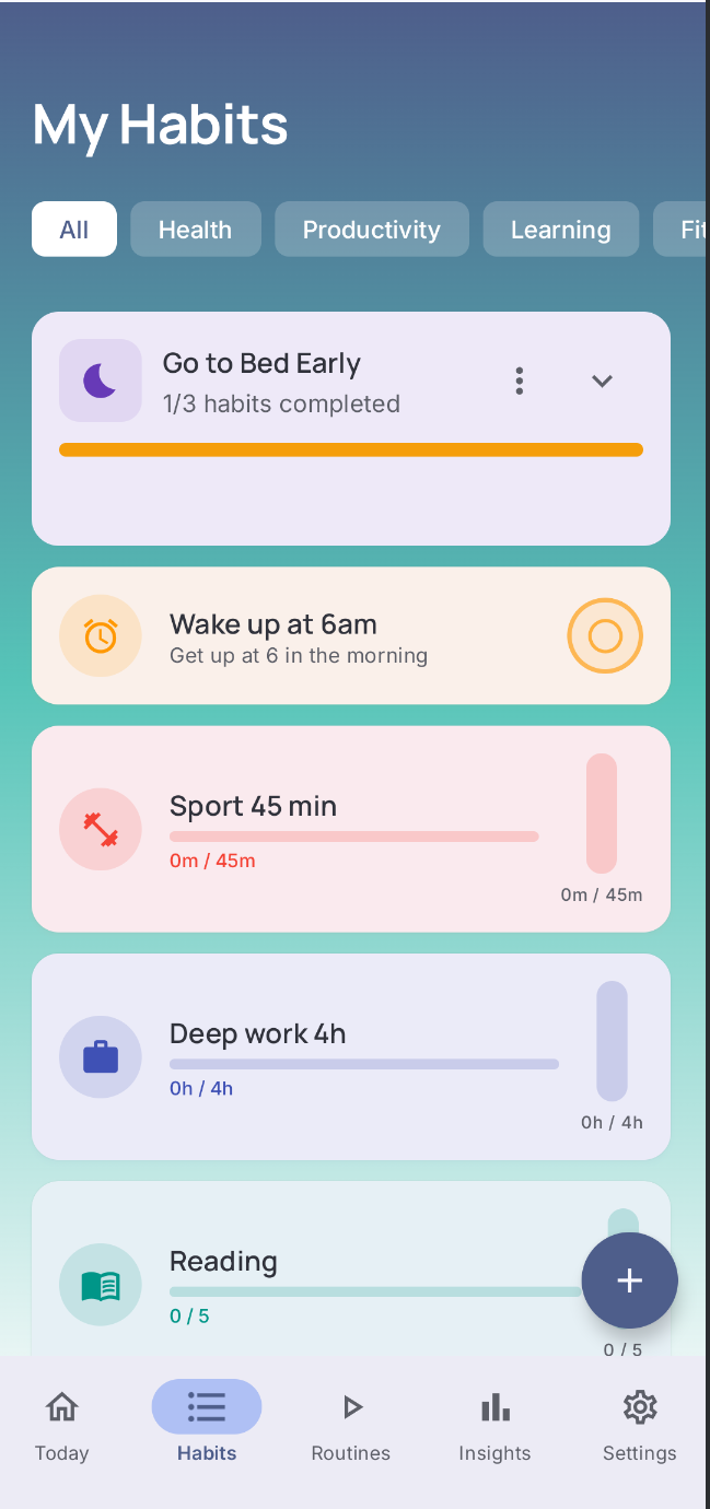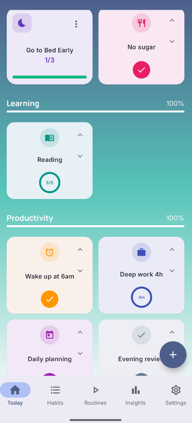 Today rassemble toutes vos habitudes en un coup d'œil. Routini vous permet de les enchaîner en blocs complets — matin, étude, sport ou pratique spirituelle.