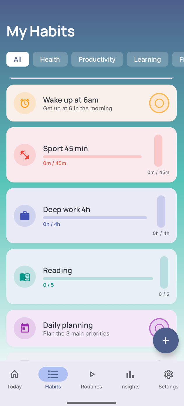 La plupart des apps d'habitudes se limitent à la productivité. Routini couvre aussi la santé, la spiritualité, l'apprentissage, les relations et la créativité.